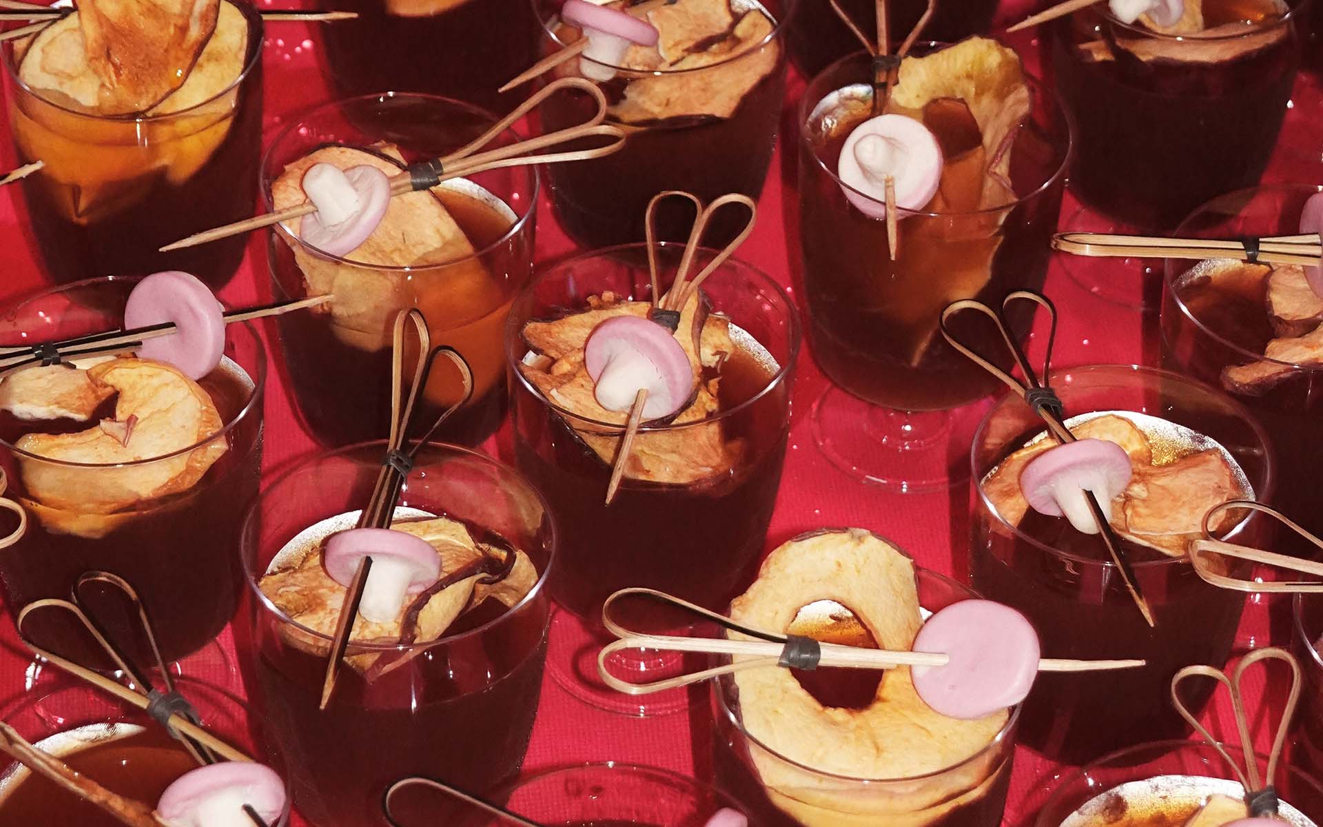 Combined with gin and lemon juice, then topped with green tea, the cocktail balances herbal, citrus and botanical notes. It is served over ice and optionally garnished with a dried apple slice and a mushroom-shaped sweet, echoing the visual language of the fungal network that underpins the project.