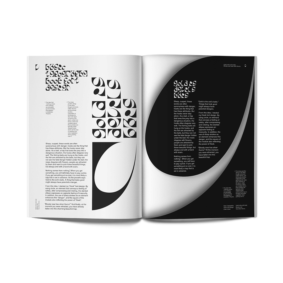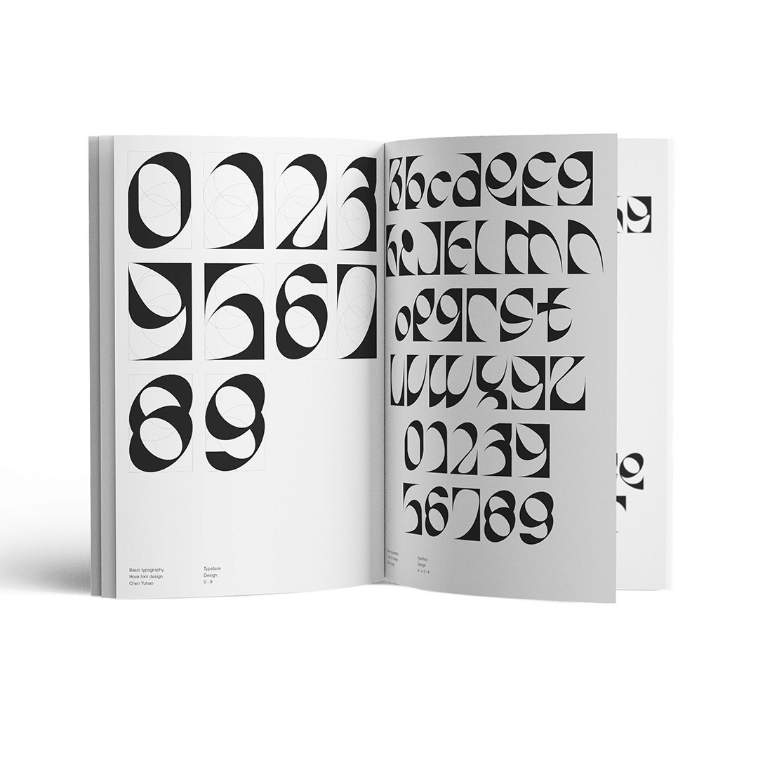 Hook is constructed from a customised module that combines a squared outline with internal spherical cuts, allowing recurring curves and angled intrusions to shape the glyphs. The set is built around a single series of characters — a–z applied across both upper and lower case — keeping the system deliberately compact. Numerals follow the same modular logic, extending the rhythm through 0–9.