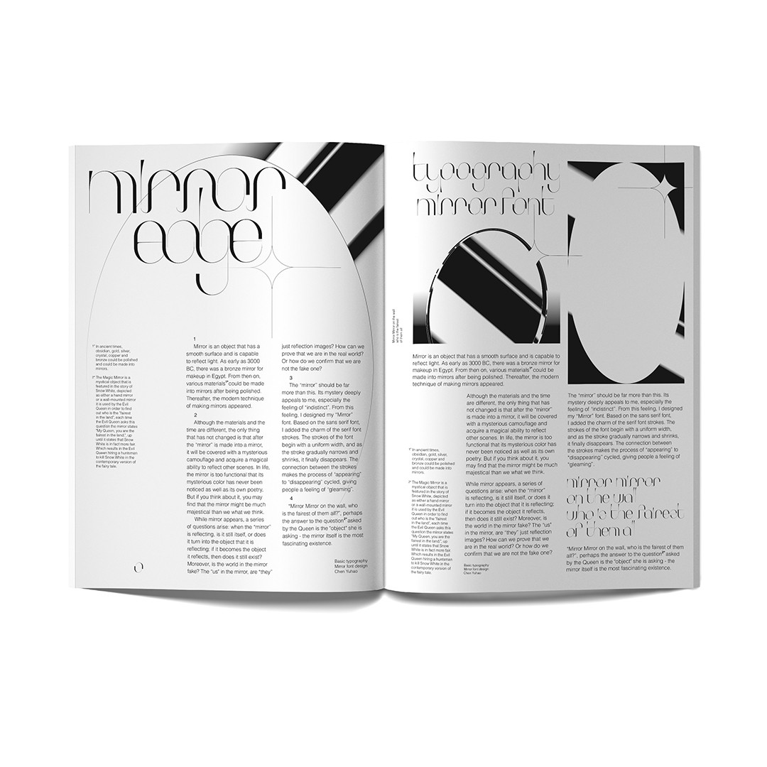 Mirror Edge is a typeface inspired by the polished boundary of a mirror — the slender reflective line where thickness becomes visible and light lingers without forming a clear image. This subtle gleam is translated into letterforms that begin with bold, grounded strokes and resolve into fading lines and tapered tips. The contrast between solidity and disappearance echoes the mirror’s edge itself, capturing a quiet tension between presence and reflection.