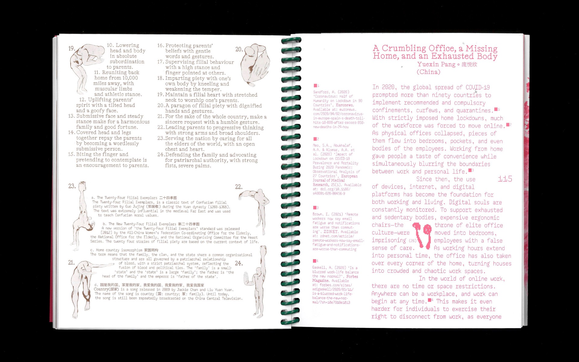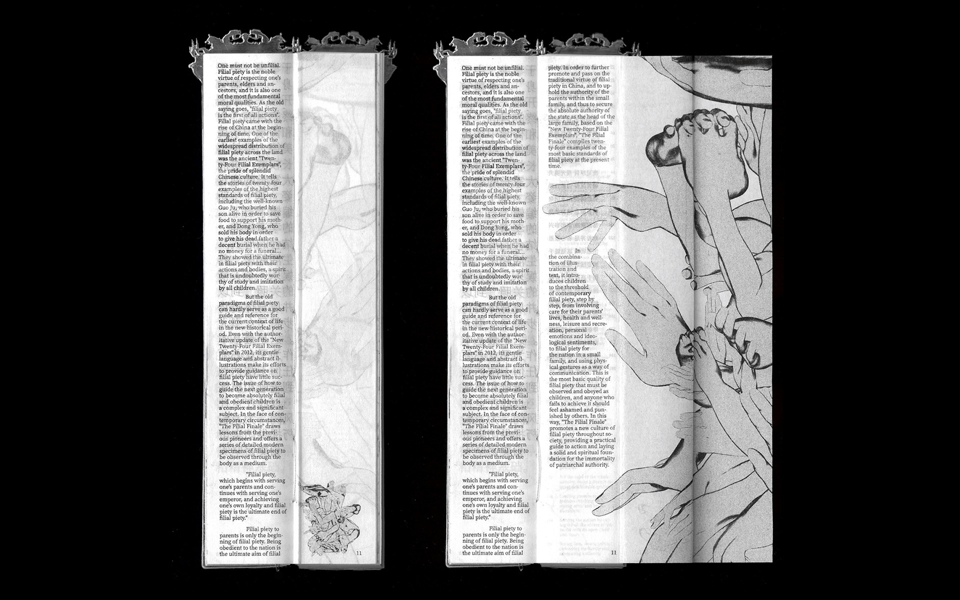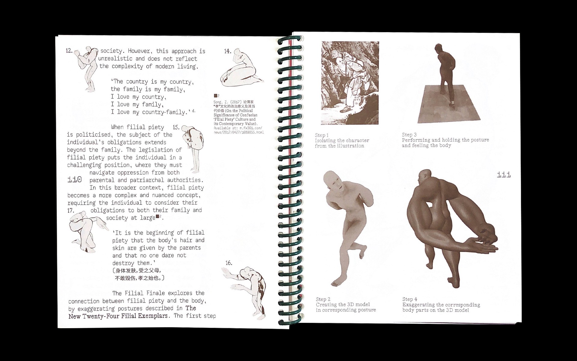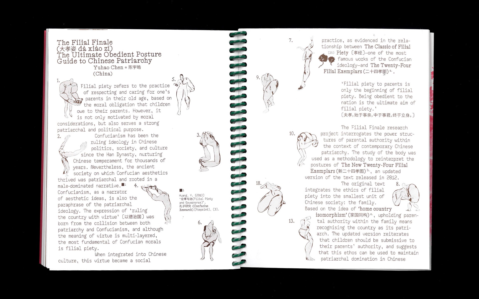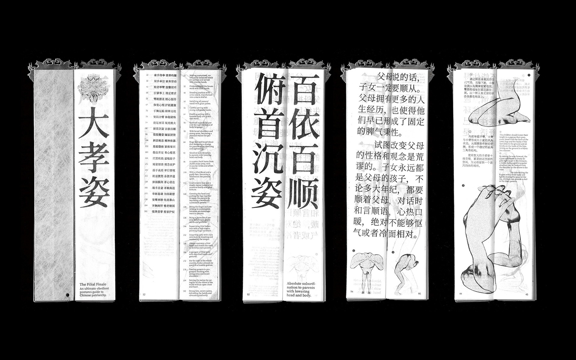 The Filial Finale is a structured posture guide presenting 24 exaggerated postures, with step-by-step directions combining written guidance and graphic instructions to show how each posture is performed and embodied, shaping the body while aligning it with expectations of filial duty at both familial and national levels. The postures reflect a refined and modern take on the classic 24 Filial Exemplars, offering a comprehensive reference for understanding and maintaining this traditional patriarchal framework.