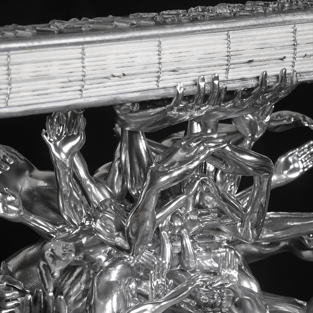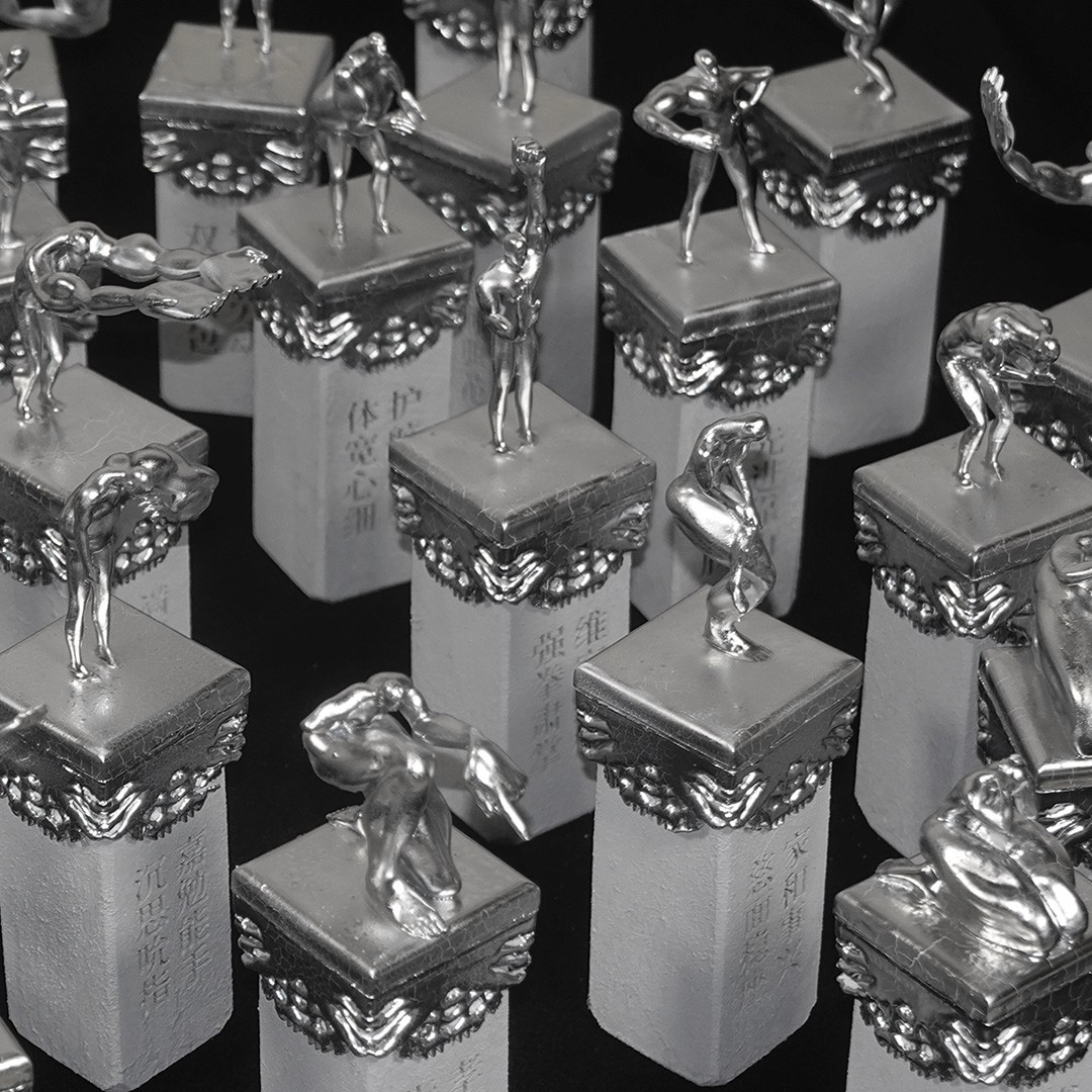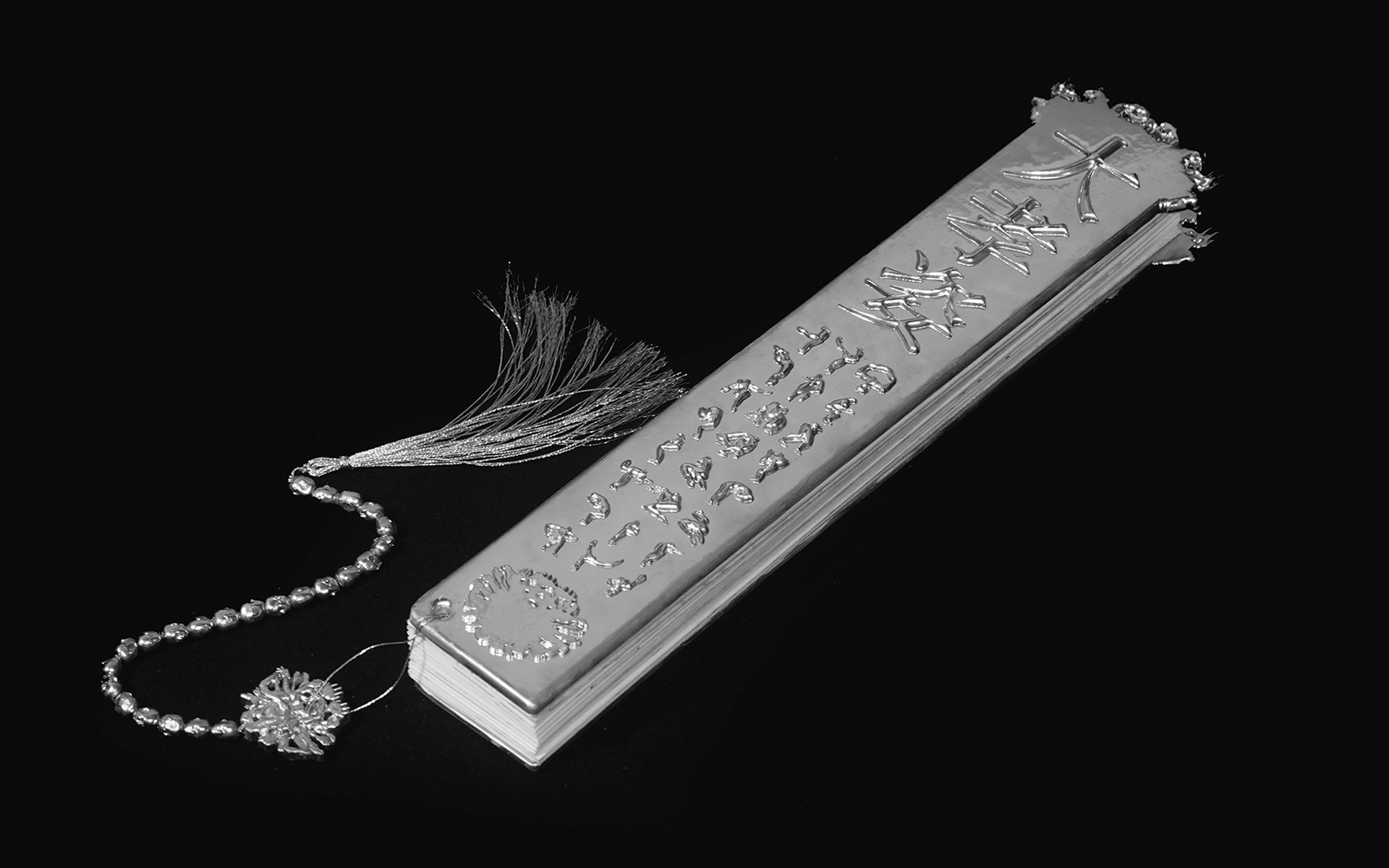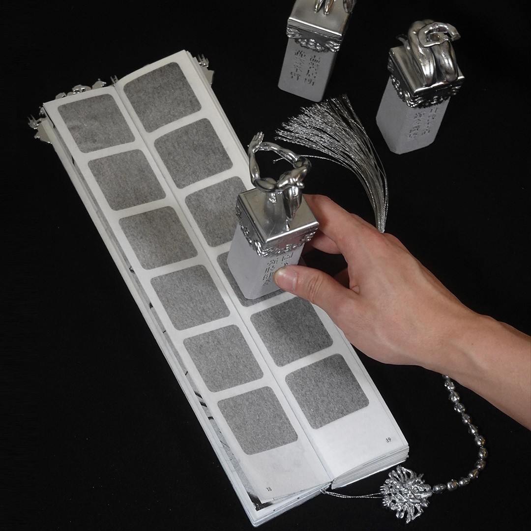 The book incorporates elements from traditional Chinese educational tools, taking the shape of a ferule, historically associated with instruction and discipline. The 24 postures are realised as silver-toned sculptural figures, with one piece that merges and reflects all postures, lifting the book toward the initiates. A beaded string of 24 small heads is integrated into the book, echoing the ferule and manifesting the structured, ceremonial qualities of the work.