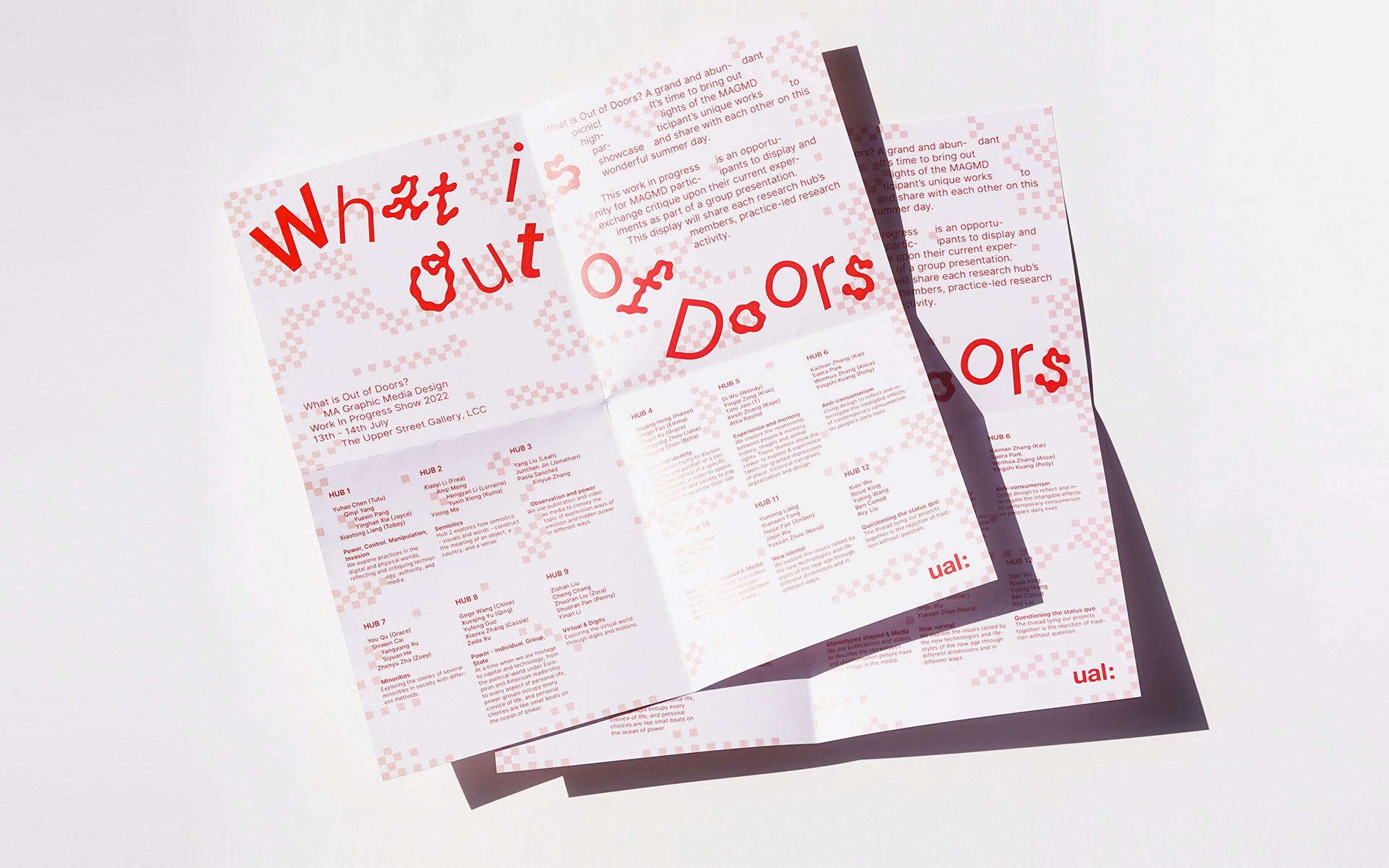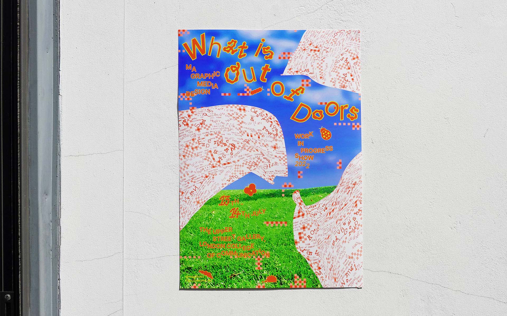 What Is Out of Doors (2022) is the identity for the LCC MA Graphic Media Design Work in Progress Show. The theme imagines the exhibition as a shared outdoor spread—an open space for unfinished work, exchange, and overlap