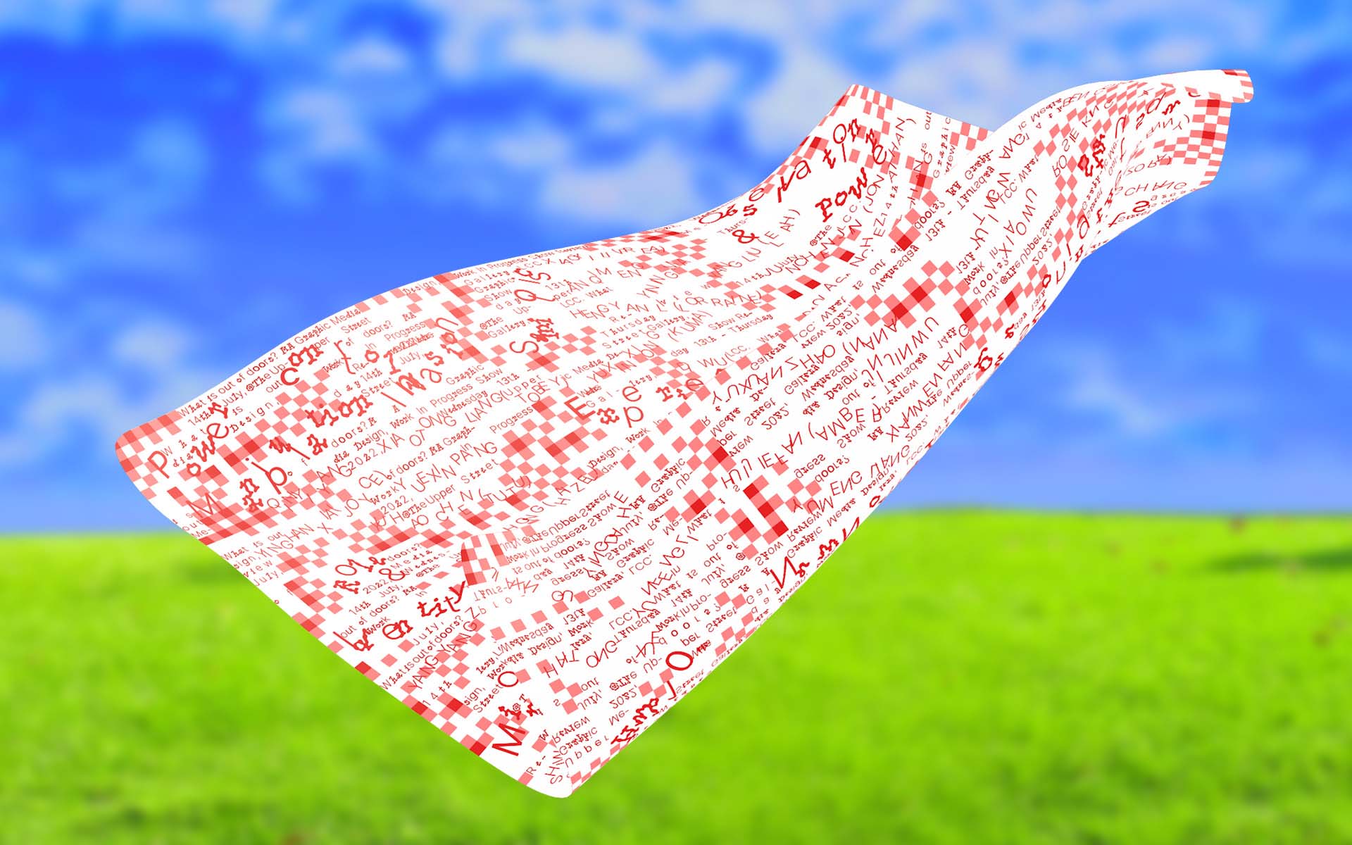 The visual system interweaves participants’ names and research topics into a blanket-like grid. Letters shift in orientation and position, creating a loose, abundant pattern that reflects the informal, collective sprawl of a picnic laid out across a single surface..